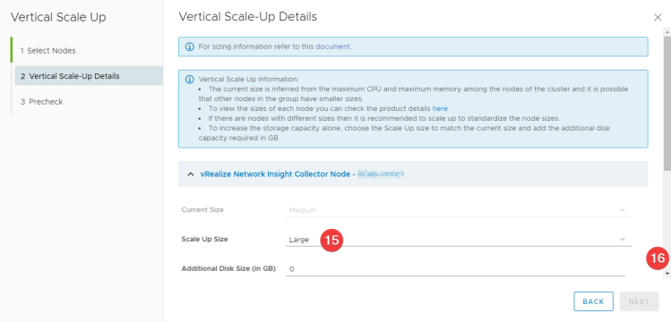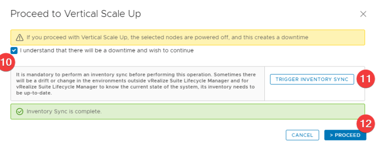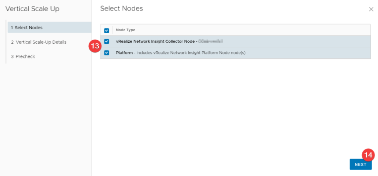 In the vRNI environtment, click on the three dots (8) again, and then Vertical Scale Up (9). A new window will appear. Verify (click) “I understand that there will be a downtime and wish to continue” (10) and trigger an inventory sync (11). When the sync is complete, click > Proceed (12). Next step is to select which nodes (13) you want to scale up. In my case we needed to scale up both the platform node and the collector. Click Next (14).