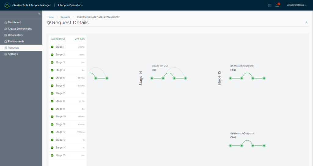 The Vertical Scale Up request contains 15 steps. You can follow them in the vRSLCM Request Details. Here is the start and finish: