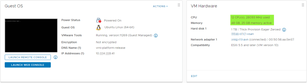 Checking the VMs in the vCenter, you should notice the CPU & Memory having changed – here is a screenshot of the platform node. It has changed from 8vCPU/32GB to 12vCPU/48GB.