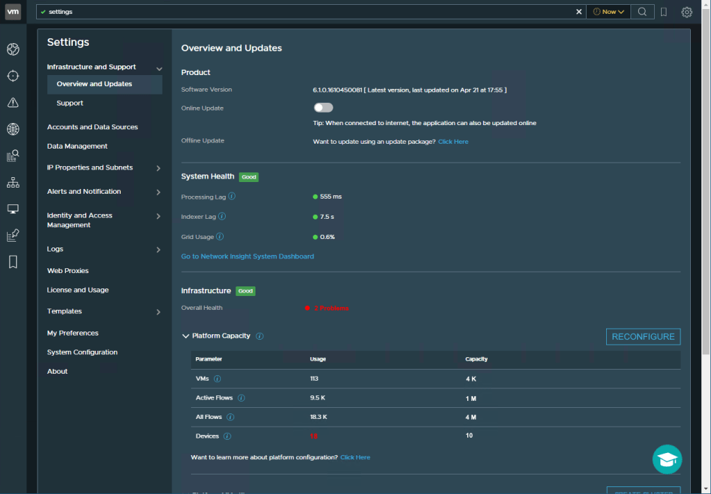 After the vRNI nodes are back up running with the new brick size (of Large in my environment), you need to tell vRNI that it needs to reconfigure for the new resources. Navigate to Overview and Updates (Cog Wheel > Settings > Infrastructure and Support > Overview and Updates). There you should see a Reconfigure button next to the Platform Capacity section: