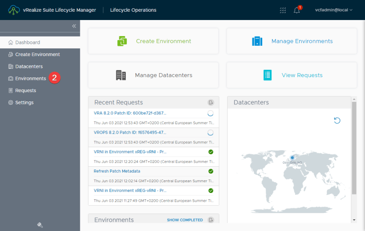 Log into vRSLCM. Click on Lifecycle Operations (1), Environments (2) in the menu to the left, and then View Details (3) for the vRNI environment.
