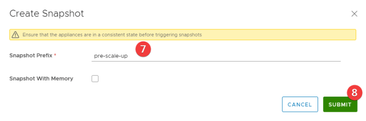 Wait for the environment page to load, and then click on the tree dots (4) to bring up the menu. Make a snapshot by clicking on Snapshot (5) > Create Snapshot (6). Give the snapshot a (prefix) name (7), and hit submit. This will initiate a task that takes a snapshot of all vRNI VMs (platform/collector).