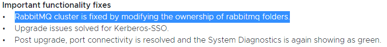 WSA was initially installed with v3.3.4 on VCF 4.2. The last couple of weeks we’ve upgraded the environment to VCF v4.3.1.0 and along with that, WSA to v3.3.5. We were told this version should fix the problem, as there were many wrong ownership/permissions for rabbitmq on v3.3.4 somehow. And looking at the WSA v3.3.5 Release Notes, we see this is one of the fixed issues: