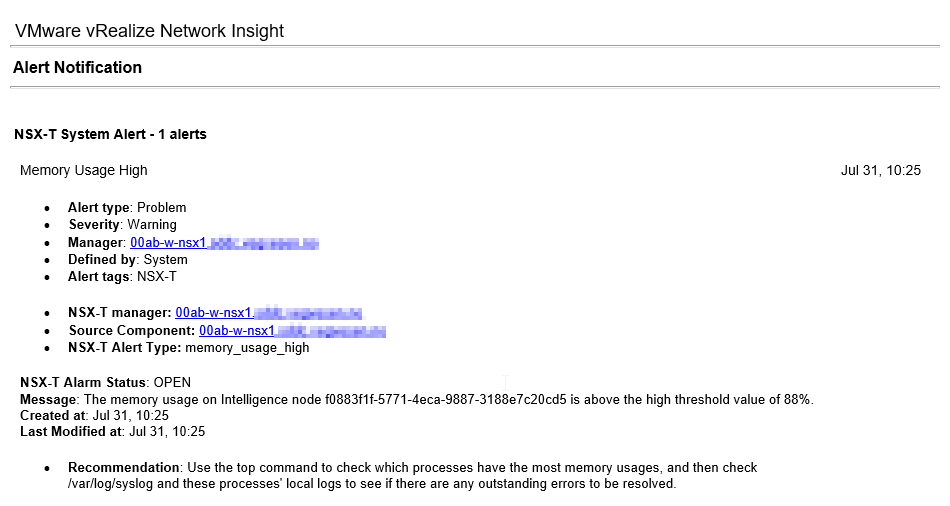 Throughout the summer I’ve received several high memory threshold alerts for NSX Intelligence in one of my customers environment. The alert was in form of an email from vRNI that got the alert from NSX-T.