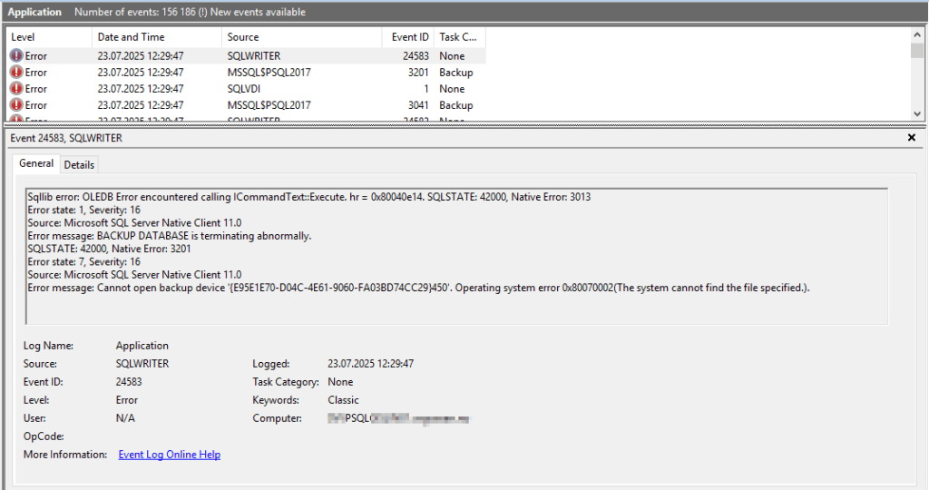 If you’re hitting this error during snapshot operations, especially with SQL Server present, you’ll likely find multiple SQL-related errors in Event Viewer, such as: