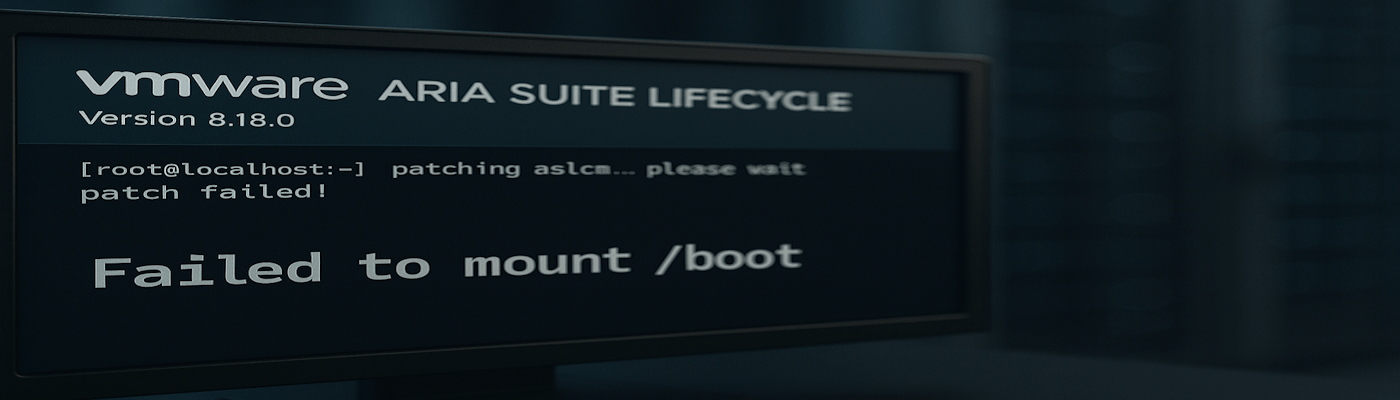Broadcom have released a new KB 406032 – “VMware Aria Suite Lifecycle 8.18 Patch 3 Installation Runbook” confirming the /etc/fstab problem described her, and also a new potential problem with a missing GPG key.