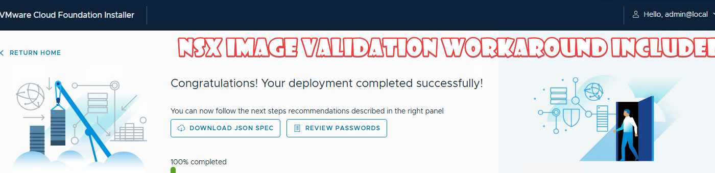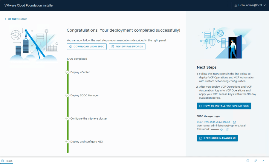 With the workaround in place, the deployment completed without issues, including NSX 9.0.0.0. From start to finish, it took just over 2 hours.