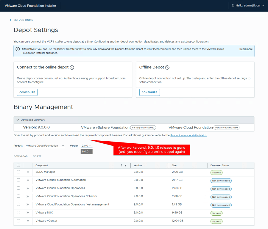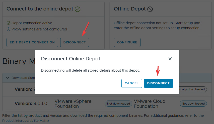 - Disconnect the online depot (this step is added by me, it was not mentioned by Broadcom). If you skip this, 9.0.1.0 metadata will come back within minutes.
