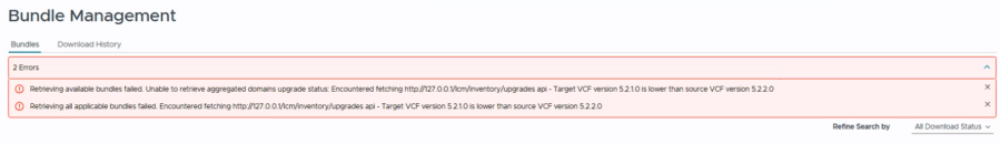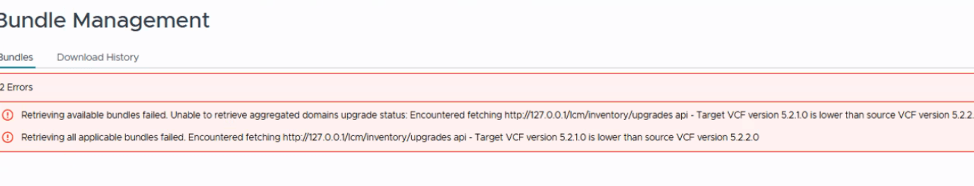 I recently upgraded a customer’s VCF test environment from 5.1.2.1 to 5.2.2.0. The SDDC Manager upgrade itself completed without problem, but when I moved on to Bundle Management to download the remaining update bundles, the list was empty and the UI only showed: