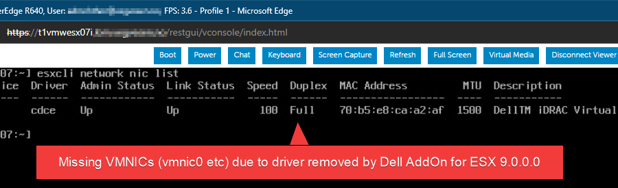 Summary: Upgrading Dell servers equipped with QLogic QL41xxx network adapters to ESX 9, using either the Dell AddOn 9.0.0.0-A00 or the Dell-customized ESX 9 ISO, will remove the QL41xxx vmnic driver, effectively disabling network connectivity. A workaround for this issue (driver reinstallation) is provided below. ⚠️Note: this is not a supported configuration for running ESX… Read More ESX 9 Compatibility Issues with Dell Servers and QL41xxx NICs
